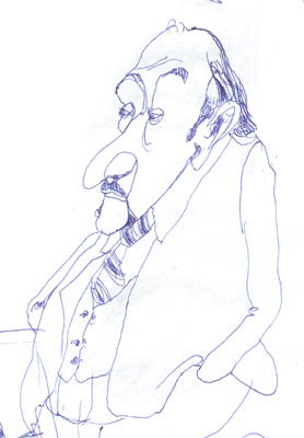 Третий рисунокА вот этот мужчина с длинным носом видимо задумался и смотрит куда-то, руки засунул в карманы и чего-то ждет. А ждать то нечего волосы от мыслей время не вырастут, сколько не думай, нужно действовать! А для художника - действовать значит рисовать! Рисовать рисовать и рисовать. А чаще всего много рисовать приходится шаржей на 23 февраля, когда все хотят подарить таким вот задумчивым мужчинам с большими носами смешные шаржи в день защитника отечества, что бы развеселить их и что бы они меньше думали и больше защищали что-нибудь или кого-нибудь.